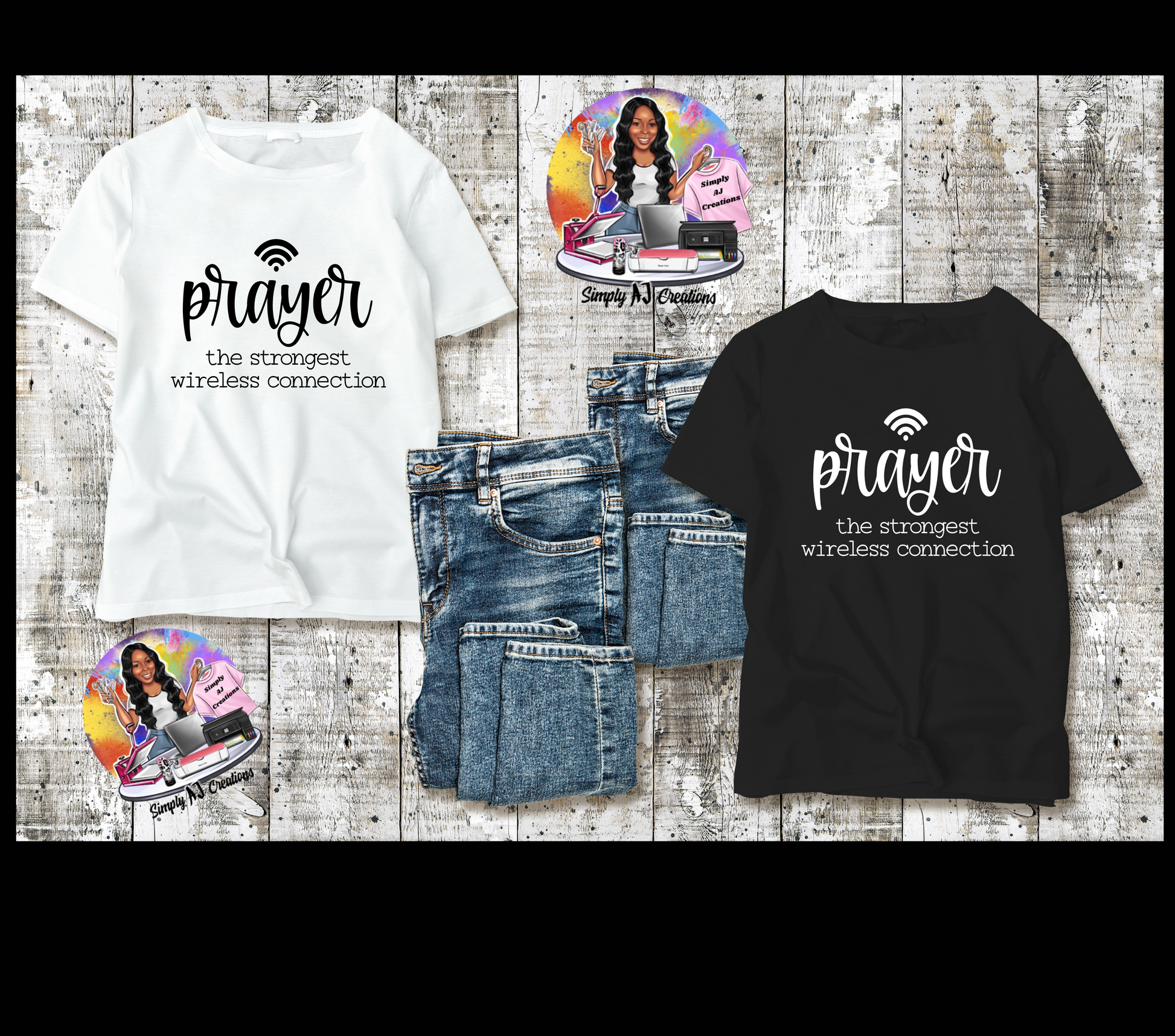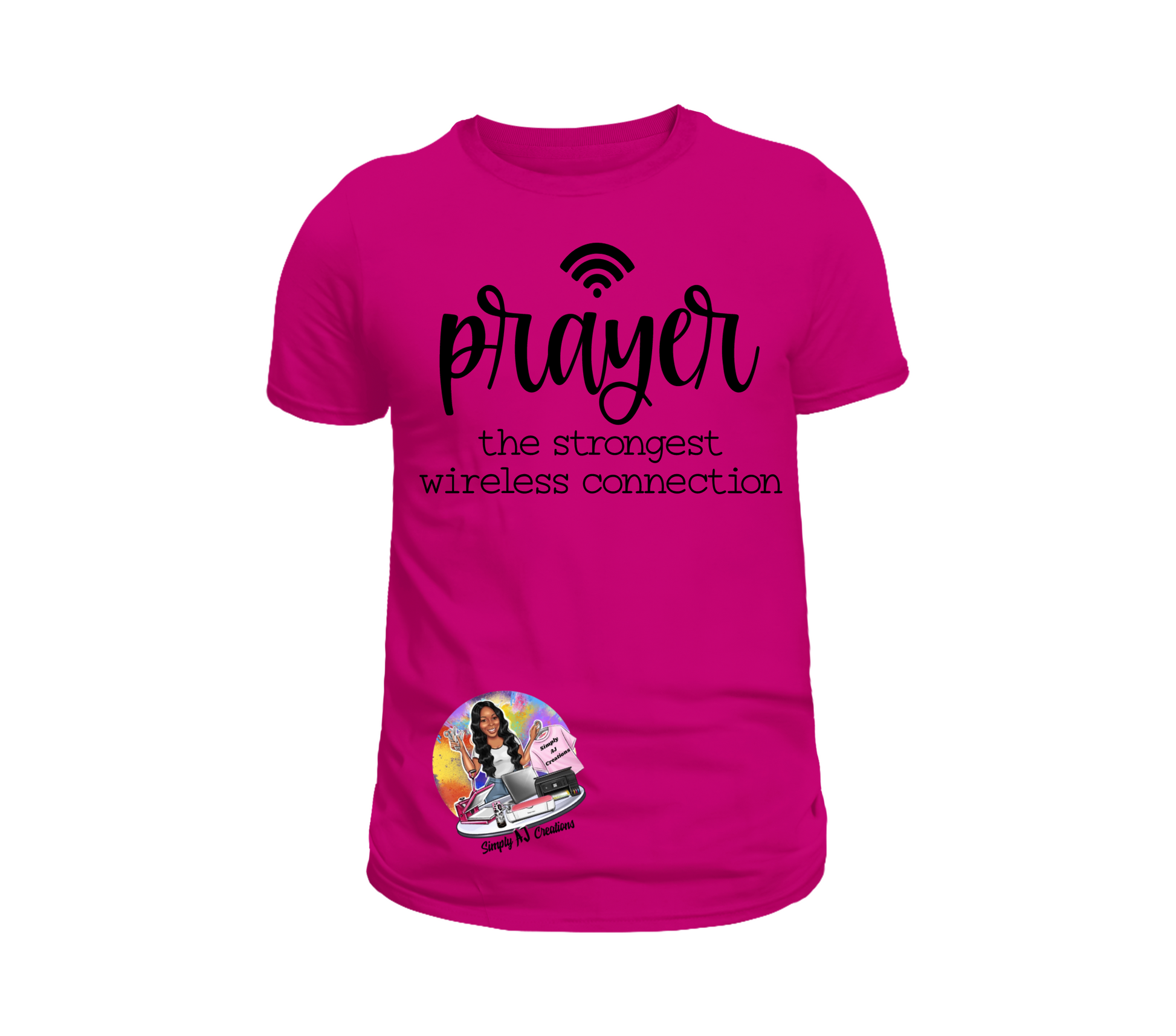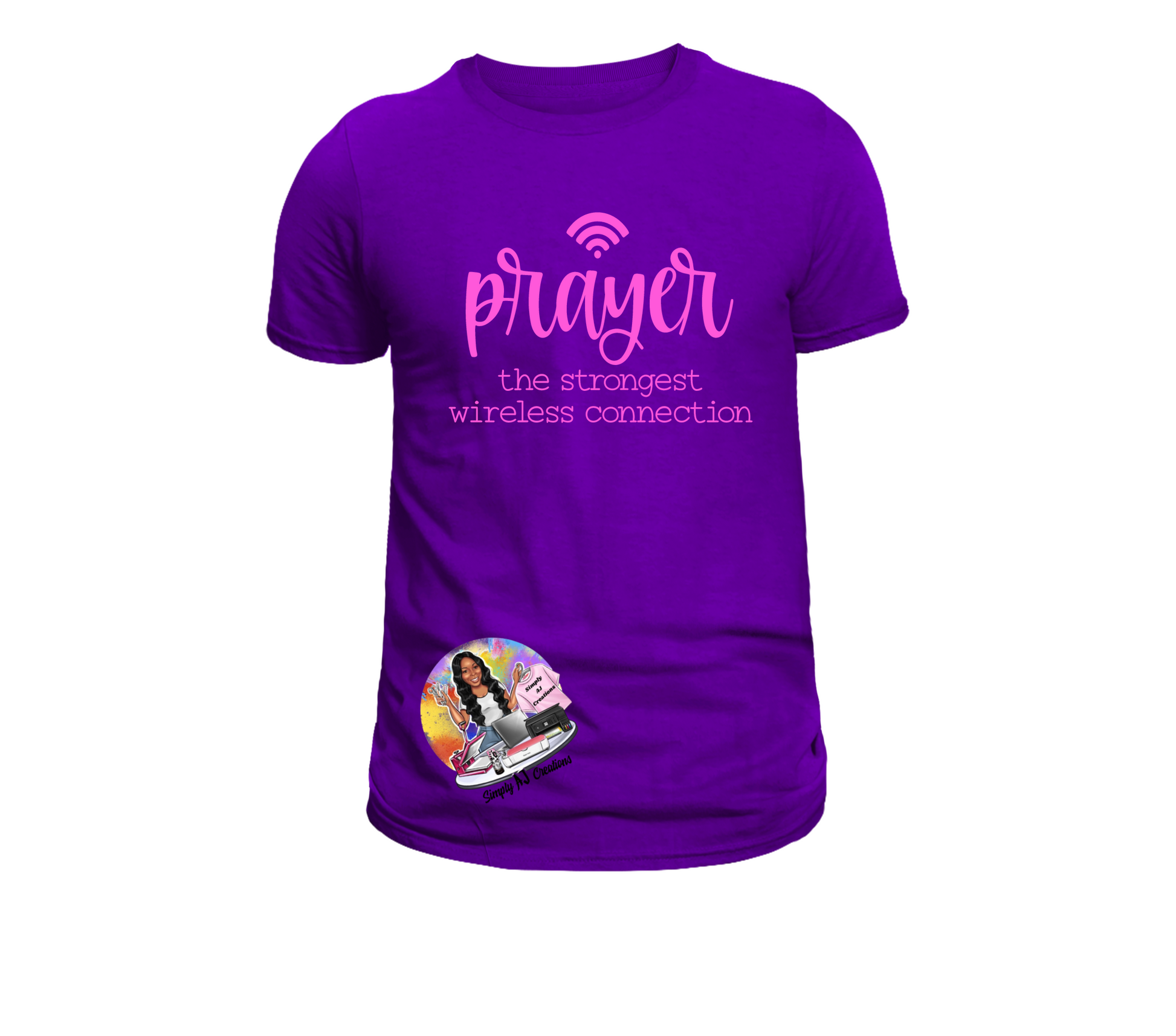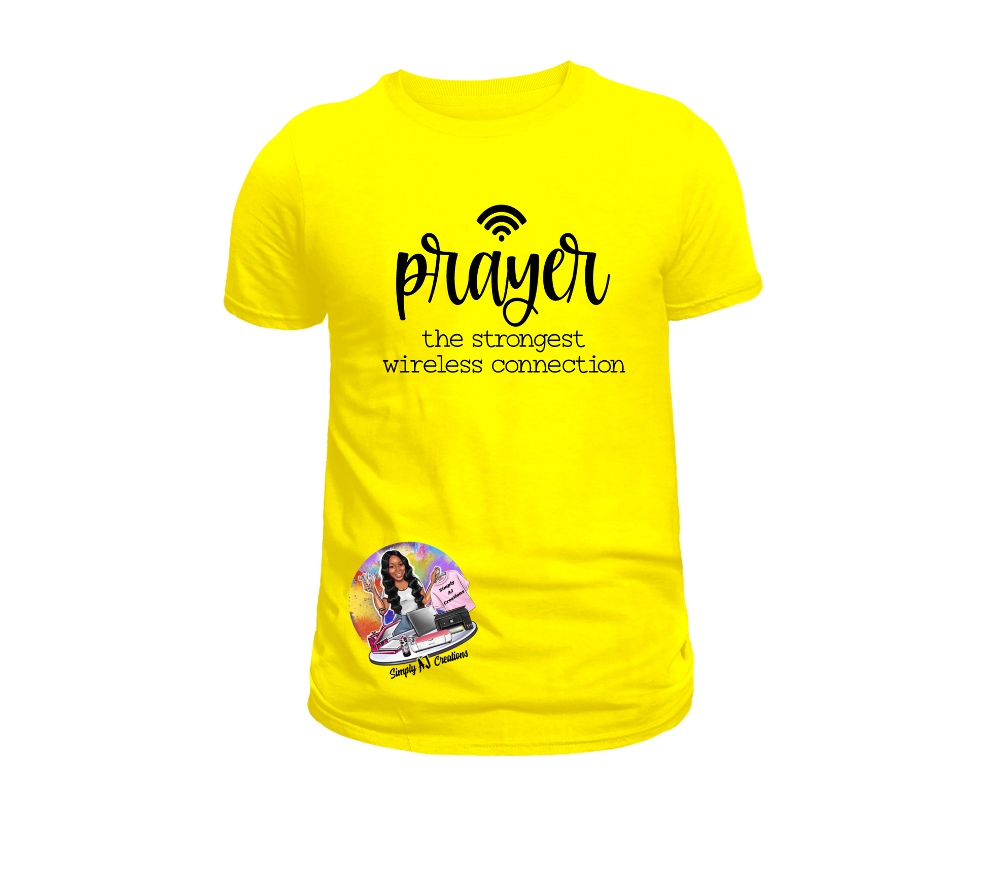 To add the color you would like the words (Prayer/The Strongest Wireless Connection) to be please add this item to your cart and in the Order Special Instructions box enter the color you would like. the words (Prayer/The Strongest Wireless Connection) to be. If you would like a t shirt color that is not listed please reach out to our customer service @ simplyajcreations@yahoo.com